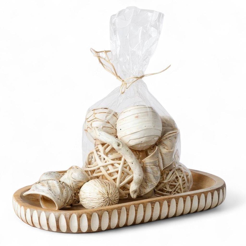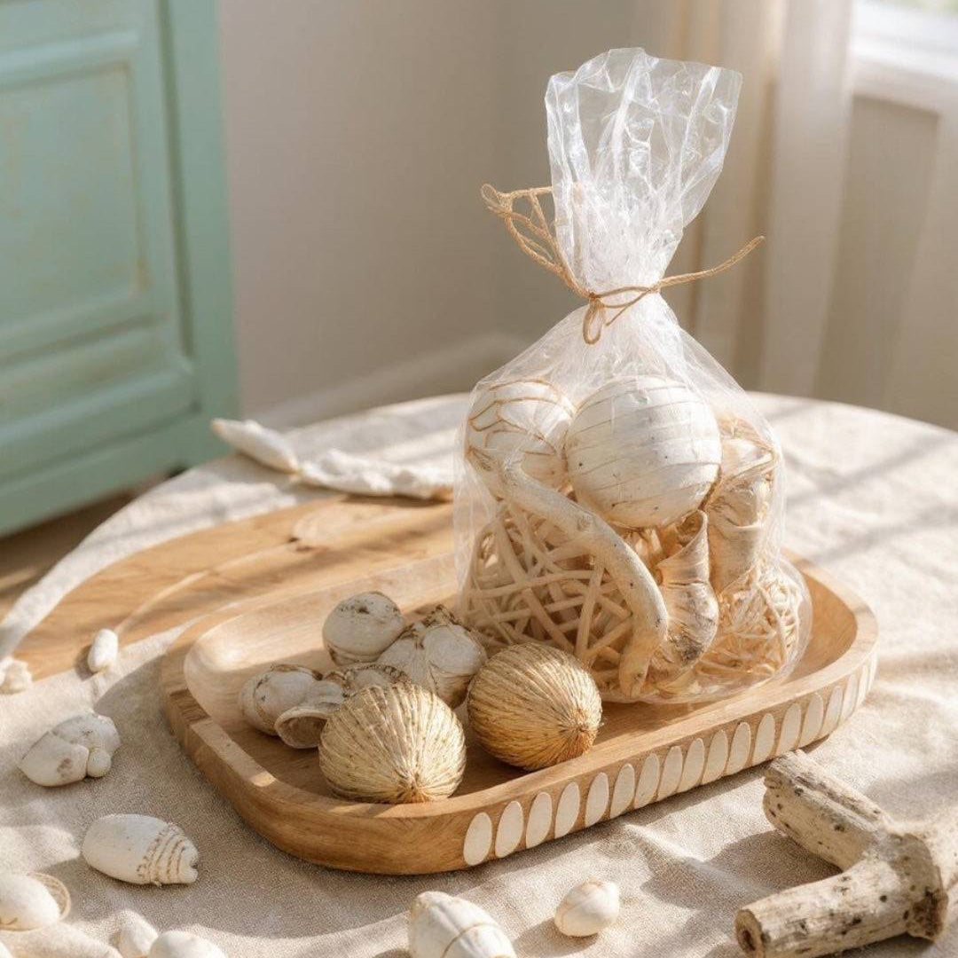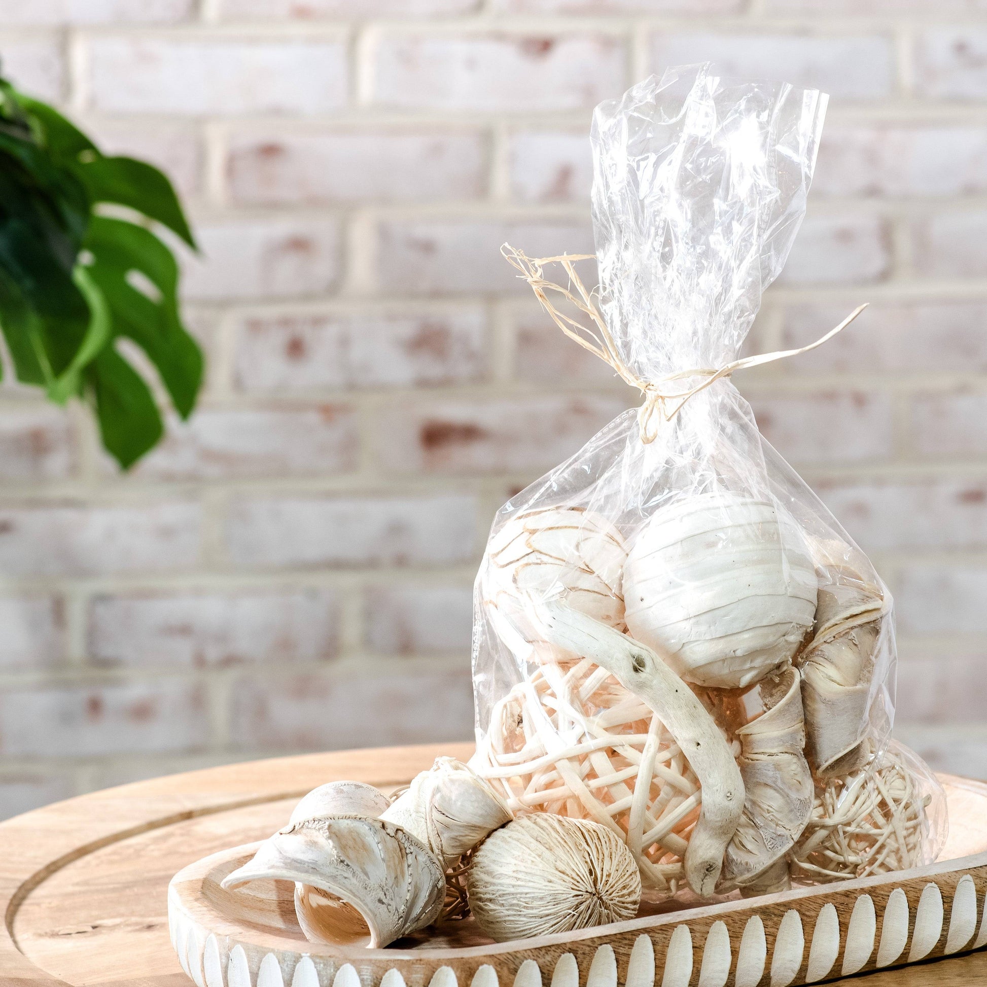 This bleached wood bowl filler set features a curated mix of textured natural elements in soft, neutral tones. Tucked neatly inside a clear bag and tied with raffia, the assorted pieces range from woven spheres to sculptural wood accents, offering organic depth and dimension to bowls, trays, or centerpieces.