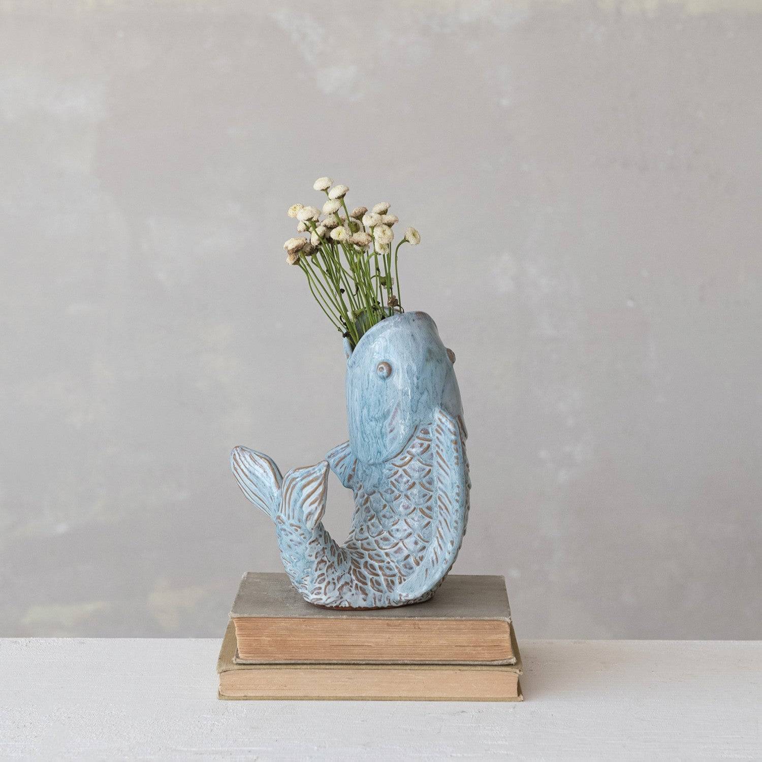 Bring coastal artistry into your home with this fish-shaped stoneware vase. Finished in a reactive blue glaze, each piece features natural tonal variations that make it truly one-of-a-kind. Whether displayed with fresh blooms, dried stems, or as a sculptural accent, this vase adds playful charm and texture to shelves, tables, or countertops.