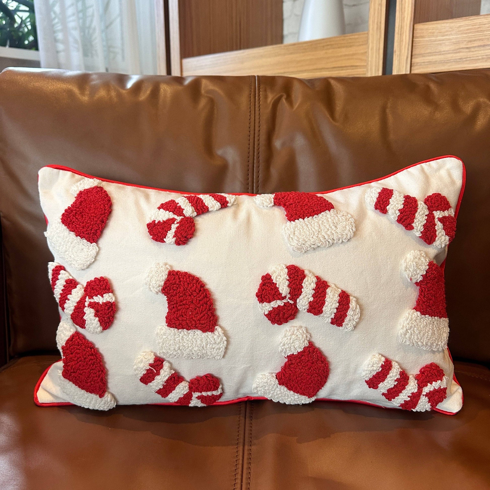 Festive and polished. This 12" × 20" white canvas lumbar pillow cover features textured candy cane & Santa hat motifs, finished with red piping, a hidden zipper, and a solid white back. Style on sofas, beds, and benches; pair with a 14" × 22" insert for a full, designer look.