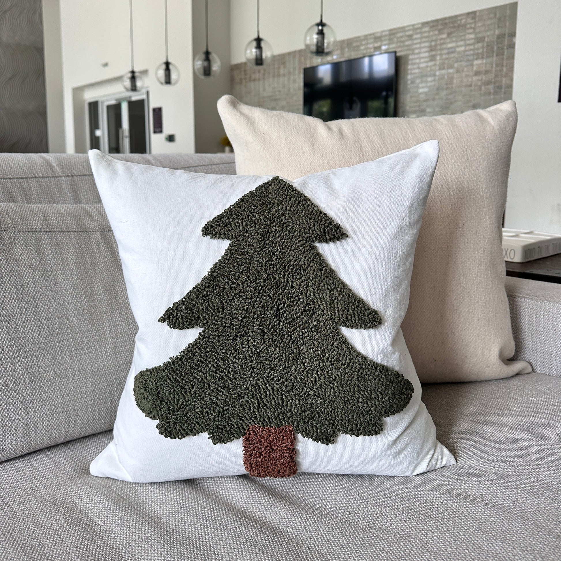 Add a cozy, handcrafted touch to your holiday home with our Forest Green Tufted Christmas Tree Pillow Cover. Designed on a white canvas base, this festive piece features a richly textured tufted tree in deep forest green with a brown trunk. A hidden zipper keeps the look clean and modern, perfect for layering on your sofa, bed, or entryway bench all season long.