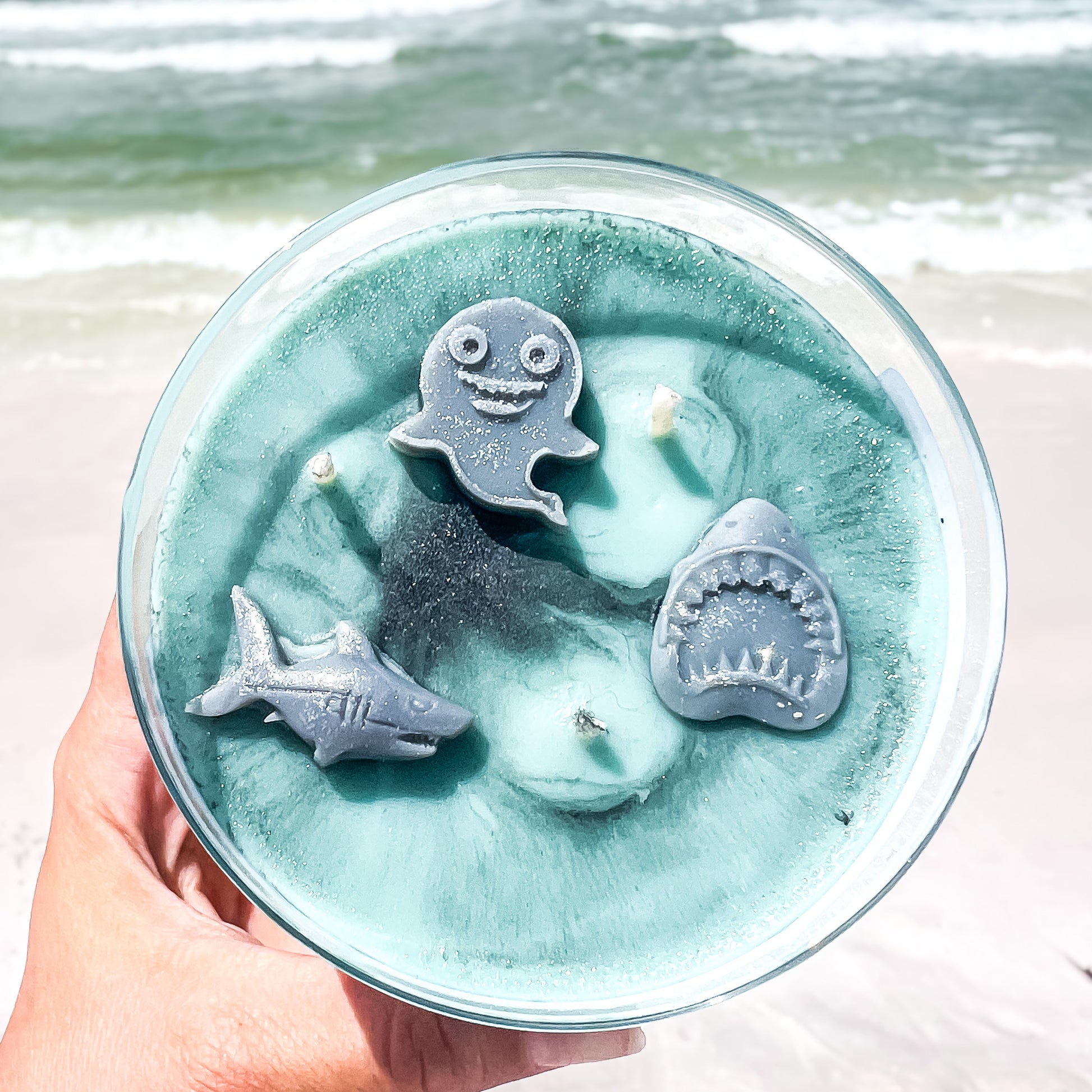 Escape to the open water with Great White, a refreshing blend of salty ocean air, deep musk, and warm sandalwood. This candle features shark wax melts and a dusting of glitter on top for that deep water shimmer.