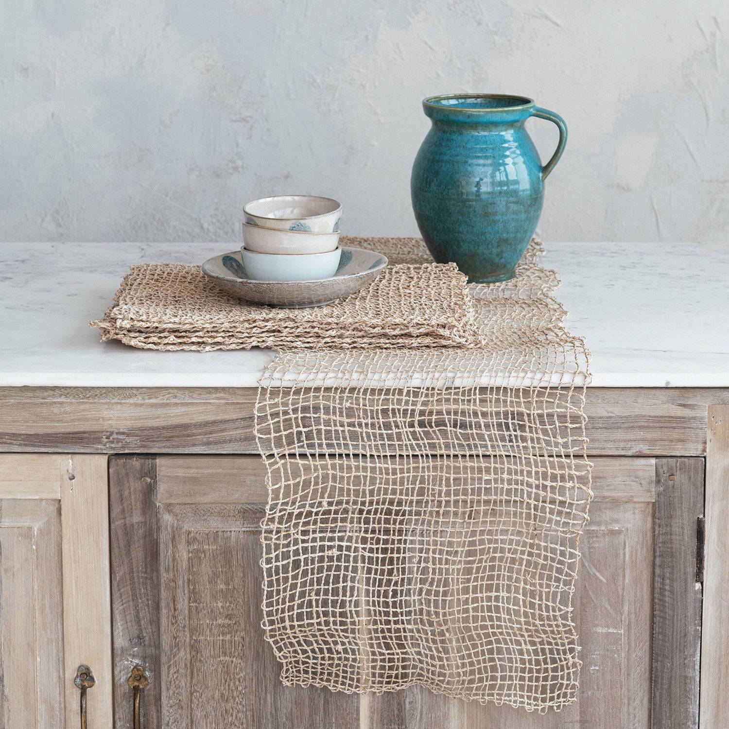 Add an element of earthy sophistication to the dining space with our Natural Weave Banana Leaf Table Runner. Skillfully hand-woven, this piece embodies a blend of natural aesthetics and functional design. Its elongated shape and neutral tone make it a versatile accessory for any occasion, harmonizing with farmhouse simplicity, boho vibrancy, or Scandinavian minimalism. Crafted from sustainable banana leaf fibers, this table runner not only adds style to the table setting but also contributes to natural living. We love this table runner in particular because of its versatility, it can be used in so many creative ways and fit into a wide variety of decor themes.