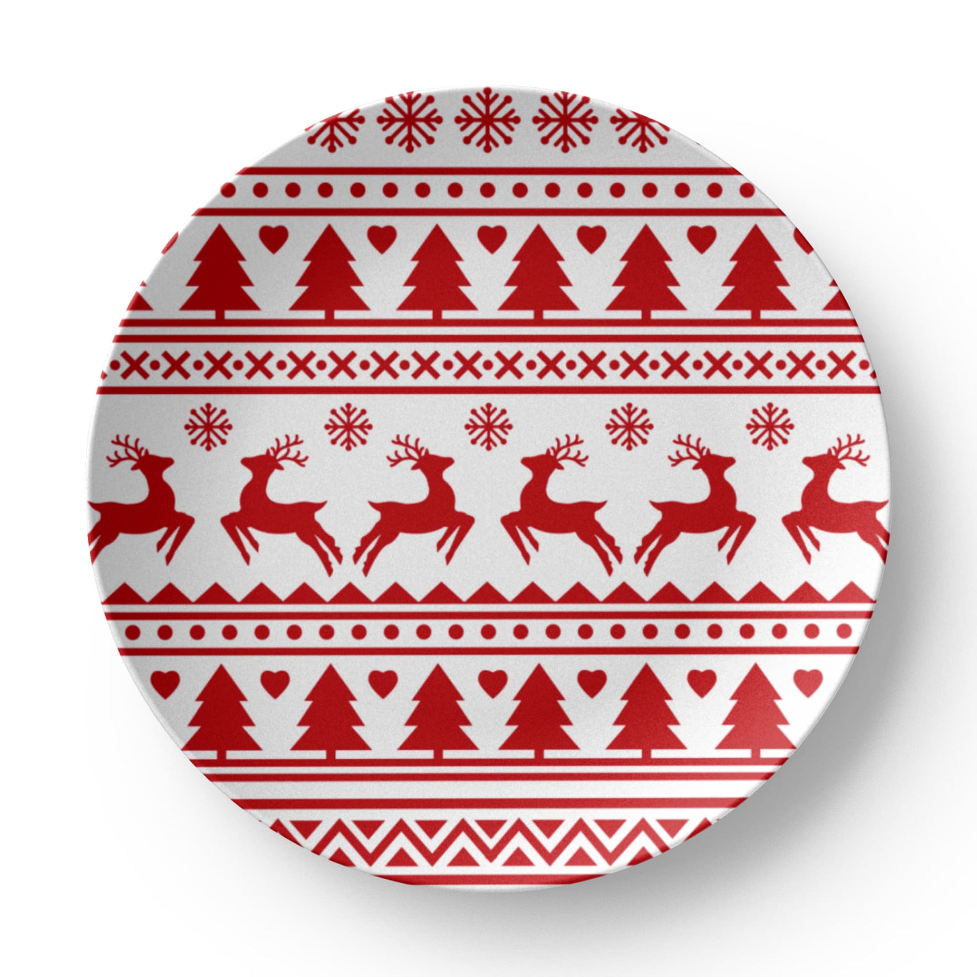 Red & White Fair Isle Reindeer Ceramic Dinner Plate 10 Inch | Nordic Christmas Dinnerware